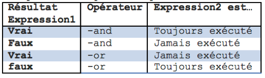 De plus, on peut combiner ces différents tests au moyen d’opérateurs logiques : -and, -or et –not en les regroupant sous forme de blocs, protégés par des parenthèses :
