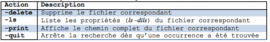 ATTENTION : l’utilisation de l’option –delete doit être effectuée avec précaution. Il est conseillé de toujours lister les fichiers recherchés, à l’aide de l’option –print auparavant.