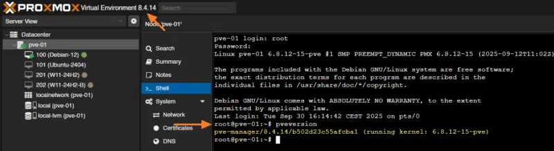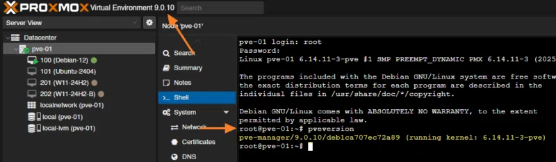 Suite au redémarrage de votre nœud PVE, vous devez disposer de Proxmox VE 9 dans sa dernière version ! C'est bien spécifié en haut à gauche et vous pouvez le vérifier en ligne de commande.