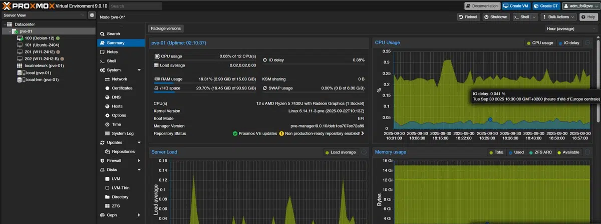 Tout d'abord, rappelons que Proxmox VE 9 est disponible depuis le 5 août 2025. Cette version basée sur Debian 13 Trixie, elle-même sortie le 9 août 2025, apporte son lot de nouveautés, comme l'explique cette page du site officiel de Proxmox. Depuis, plusieurs mises à jour mineures ont été publiées par l'équipe de développement : la version la plus récente actuelle est la 9.0.10.