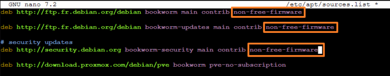 Nous allons donc éditer le fichier sources.list et ajouter le nom du dépôt non-free-firmware sur toutes les lignes où il est mentionné debian.org.