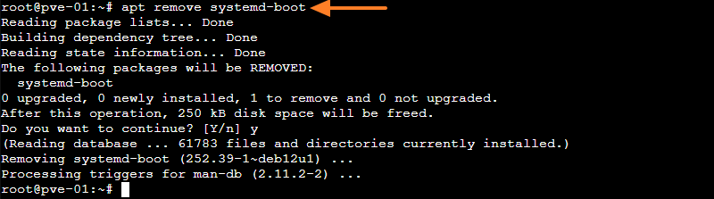 Le paquet systemd-boot n’a plus rien à faire sur Proxmox, car il entre en conflit avec GRUB et peut bloquer la mise à jour. Il convient de le désinstaller pour éviter les problèmes lors de la migration vers Proxmox VE 9. Exécutez cette commande pour résoudre ce problème :