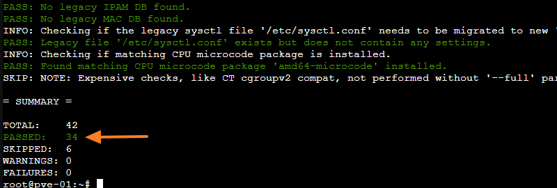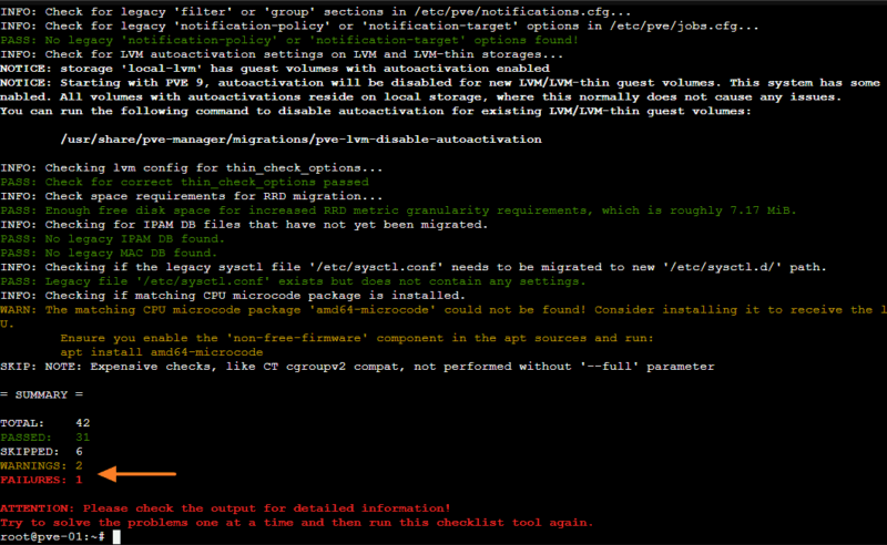 Un script prêt à l'emploi, nommé pve8to9, est fourni par Proxmox. Il sert à vérifier la compatibilité entre la configuration de votre serveur et Proxmox VE 9. Il est indispensable d'exécuter ce test pour anticiper d'éventuels problèmes.