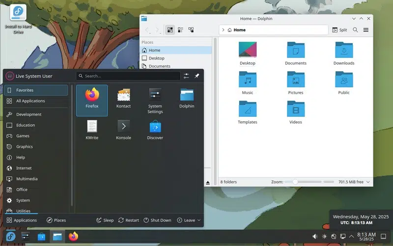 Commençons par évoquer Fedora, ou plutôt Fedora KDE (Plasma), une distribution Linux taillée pour les professionnels et le monde de l’entreprise. Ce n’est pas anodin puisqu’il s’agit de la version communautaire, et donc gratuite, de Red Hat Enterprise Linux (RHEL). Red Hat est donc le mainteneur de cette distribution qui est une référence. Une nouvelle version de Fedora est publiée environ tous les 6 mois, et chaque version bénéficie de 13 mois de support.