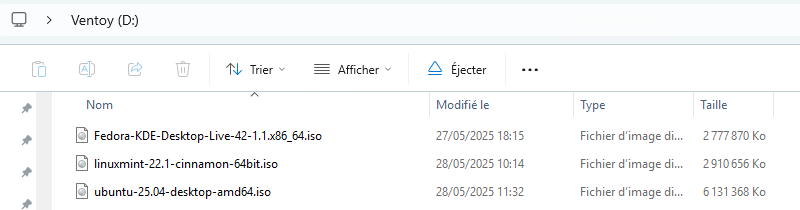 Quand la clé est créée, vous n'avez qu'à copier-coller vos images ISO sur votre clé USB nommée Ventoy. Vous pouvez ajouter des images de distribution Linux, mais aussi de Windows. Vous obtenez un résultat similaire à celui-ci :