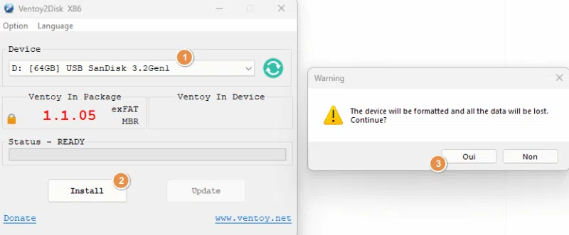 Commencez par télécharger Ventoy à partir du GitHub officiel du projet. Vous obtenez une archive ZIP ("ventoy-1.1.05-windows.zip") qu'il faudra décompresser sur votre ordinateur. Ensuite, exécutez le programme nommé Ventoy2Disk.exe. Vous n'aurez plus qu'à sélectionner votre clé USB (1) puis cliquer sur "Install" (2) pour créer votre clé USB Ventoy. Votre clé USB sera formatée, donc vous serez invité à confirmer (3).