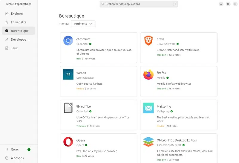 Ci-dessous, un aperçu du magasin d'applications d'Ubuntu. De nombreuses applications sont accessibles en quelques clics.