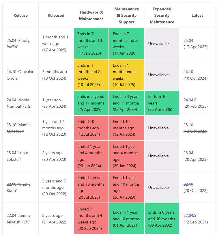 - Ubuntu 25.04 est disponible depuis le 17 avril 2025. Cette version intègre les dernières nouveautés d’Ubuntu et elle va bénéficier du support principal jusqu’au 17 janvier 2026. Elle n’aura pas le droit à un support étendu pour les mises à jour de sécurité. Les utilisateurs de cette version seront invités à passer sur Ubuntu 25.10. À titre de comparaison, sur Windows 11, nous effectuons une mise à niveau de la version 23H2 à la version 24H2 lorsque la situation se produit.
