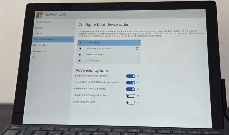 Sur ma tablette Surface, l'interface est différente puisqu'il s'agit d'un UEFI. L'objectif reste le même : positionner la clé USB en première position, ici elle est appelée "USB Storage".