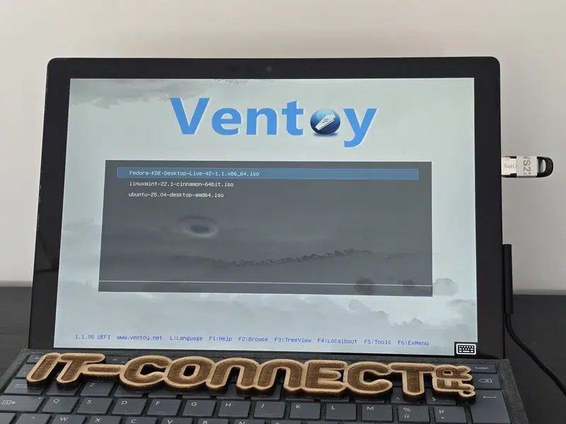 Pour créer la clé USB bootable, il y a deux applications incontournables : Rufus et balenaEtcher. Néanmoins, je vous propose plutôt d'utiliser Ventoy. Il s'agit d'une application open source que vous pouvez utiliser pour créer une clé USB multiboot : vous pouvez déposer plusieurs images ISO sur votre clé USB et choisir laquelle lancer. Ceci est très pratique, car :