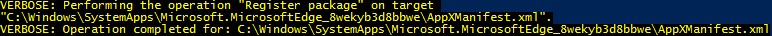 Get-AppXPackage -AllUsers -Name Microsoft.MicrosoftEdge | Foreach {Add-AppxPackage -DisableDevelopmentMode -Register "$($_.InstallLocation)\AppXManifest.xml" -Verbose}