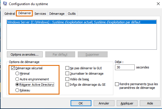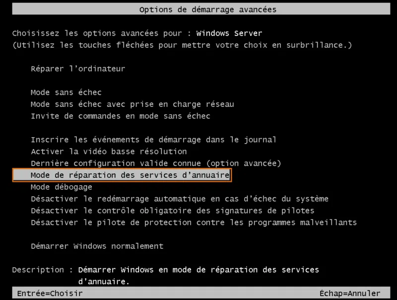 Au redémarrage, choisissez « Mode de réparation des services d'annuaire » à l’aide des touches du clavier. Cette option est aussi accessible si vous bootez sur un ISO Windows ou en appuyant sur la touche F8 plusieurs fois lors du démarrage du système.