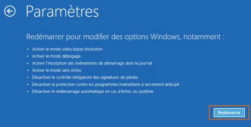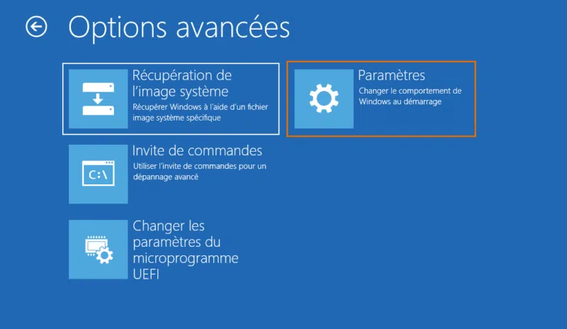 Au redémarrage, choisissez « Options avancées » puis « Paramètres ».