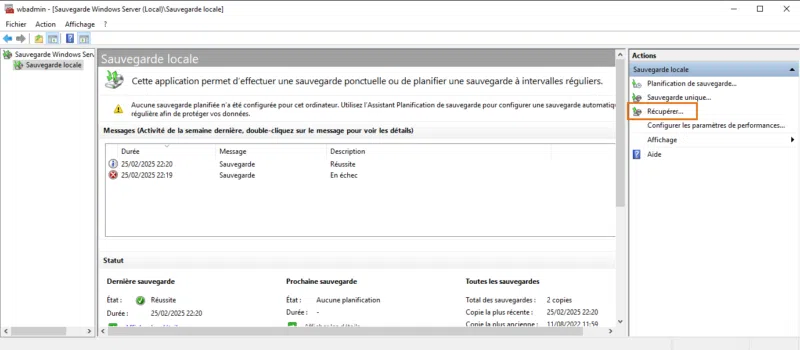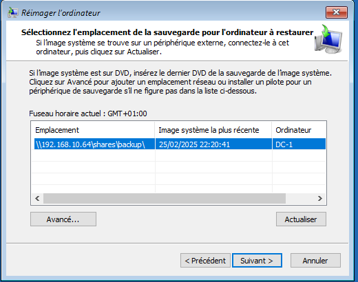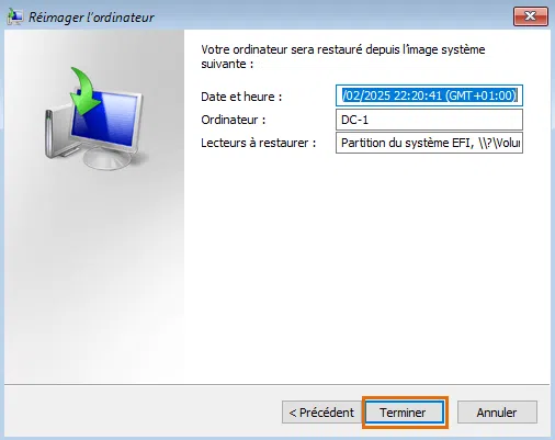 Une fois la restauration terminée, votre serveur devrait être opérationnel avec l’état exact de la dernière sauvegarde valide. Vous pouvez maintenant vous connecter et vérifier que l’Active Directory fonctionne normalement. L’avantage de la restauration à partir d’une image système est sa rapidité, puisqu’elle permet de restaurer non seulement l’AD, mais également l’ensemble des applications, tâches planifiées et configurations associées.