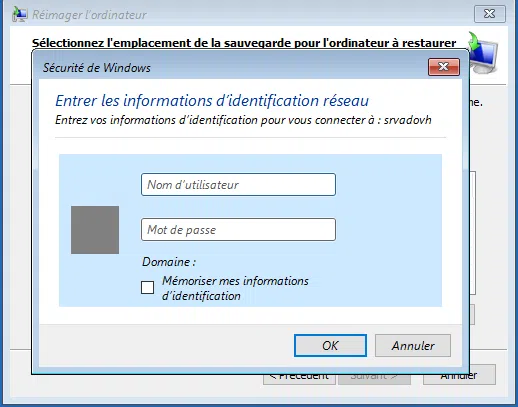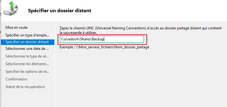 Entrez ensuite le chemin du dossier contenant la sauvegarde AD, puis cliquez sur « Suivant », saisissez ensuite vos identifiants puis cliquez sur « Suivant ». Ici, nous ciblons le partage \\srvadovh\Shares\Backup.