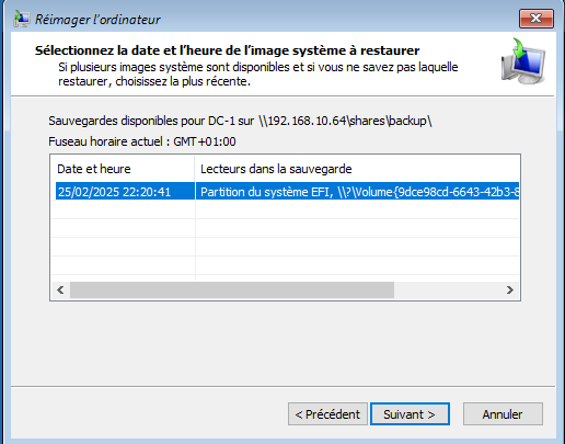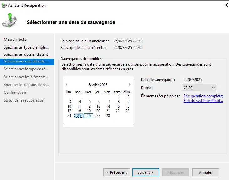 Comme pour la restauration complète, sélectionnez la date de sauvegarde à laquelle vous souhaitez restaurer l’état du système. Assurez-vous de choisir une sauvegarde valide et récente afin d’éviter toute incohérence ou perte de données critiques.