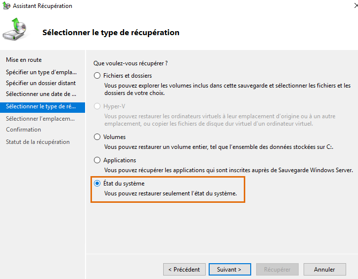 Nous avons le choix entre plusieurs types de restauration : la restauration complète du serveur et la restauration d'état du système. Selon le besoin, l'une ou l'autre peut être utilisée. Attention cependant, la sauvegarde d'état du système n'inclut pas la restauration complète du serveur. Assurez-vous de sauvegarder l'ensemble du serveur et d'être conscient des enjeux. Nous allons détailler ces deux types de restaurations.