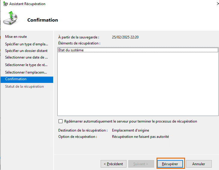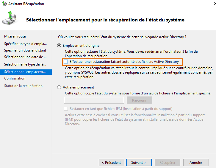 Il est déconseillé de cocher l’option "Effectuer une restauration faisant autorité des fichiers Active Directory", sauf en dernier recours. Cette option force la réplication des fichiers restaurés sur tous les contrôleurs de domaine, supprimant définitivement toutes les modifications effectuées après la sauvegarde. Cela inclut les utilisateurs, groupes, stratégies de groupe (GPO) et permissions.