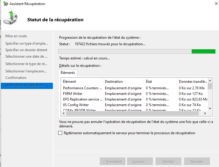 La restauration complète du serveur consiste à restaurer l'ensemble du contrôleur de domaine à un état précédent. Cette méthode est essentielle en cas de panne matérielle, de corruption majeure du système ou pour une installation sur nouvelle machine virtuelle. Elle inclut :