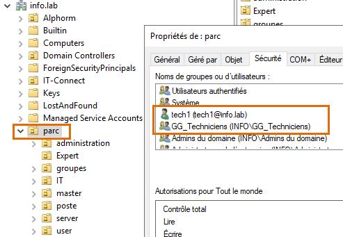 Après le redémarrage, vérifiez que l’objet restauré est bien présent. Dans mon cas, après avoir forcé une restauration autoritaire sur mon OU, j’ai pu constater que les ACL ont bien été récupérées et surtout, qu’elles ont été répliquées et imposées aux autres contrôleurs de domaine.