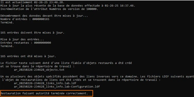 Si la restauration concerne uniquement un élément précis comme dans notre cas (restauration OU), nous devrions forcer la restauration autoritaire manuellement, chose que nous allons faire par la suite.