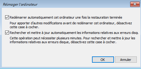 Laissez les cases par défaut pour effectuer une vérification de disque en cas d'erreur, et redémarrer automatiquement après la restauration, ajustez le choix selon votre besoin.