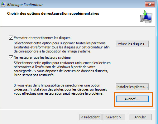 Cochez les cases pour formater le disque principal, puis cliquez sur le bouton « Avancé ».