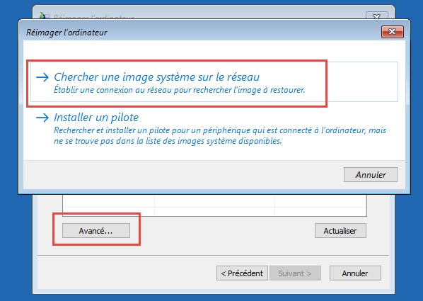 Cliquez sur « Suivant », « Avancé » puis choisissez « Chercher une image système sur le réseau ».