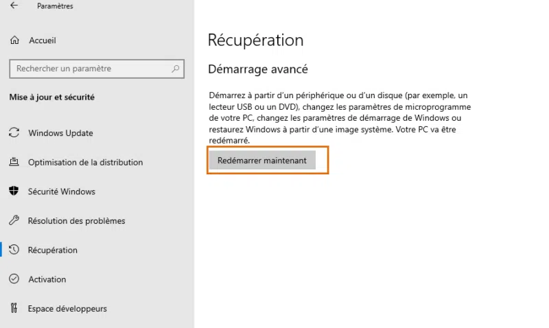 Ou bien en accédant au démarrage avancé à partir du menu Paramètres système, via les options de récupération.