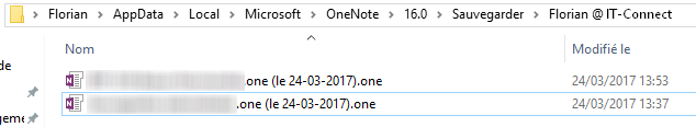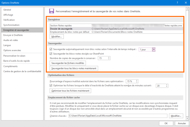 - Par défaut, vos notes sont sauvegardées dans votre profil personnel, au sein du répertoire "AppData" local dans un dossier nommé "OneNote" sous "Microsoft". Vous pouvez modifier ce répertoire si besoin pour déplacer les sauvegardes sur un espace personnel sur un serveur, par exemple. Dans le dossier "OneNote" par défaut, un sous-dossier "Sauvegarder" sera créé et ensuite il y aura un sous-dossier par bloc-notes avec chacun la sauvegarde de ses sections.