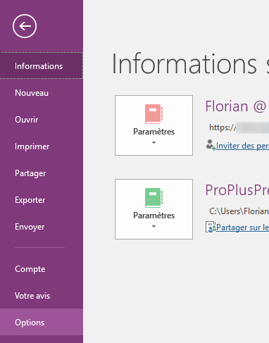 Si vous retournez dans le menu "Fichier", ensuite sous "Informations" vous pouvez visualiser vos différents blocs-notes. Cliquez sur le bouton "Paramètres" à gauche de l'un d'entre-eux, puis sur "Propriétés". Comme ceci :