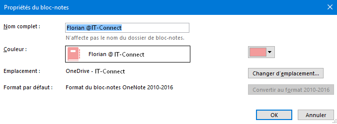 Dans les propriétés, vous pouvez visualiser le nom, ainsi qu'une information très intéressante : l'emplacement. Vous pouvez voir dans mon cas, que le bloc-note est directement hébergé sur SharePoint - Il s'agit d'un bloc-note associé à un compte utilisateur Office 365.