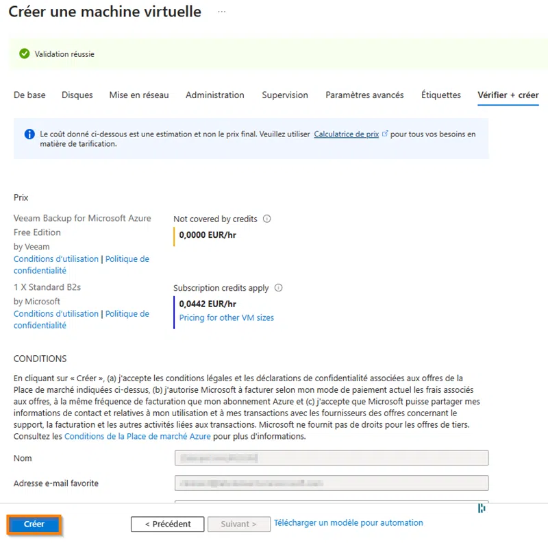 Cette étape nous permet de vérifier et valider le déploiement par la plateforme Azure et de vérifier notre configuration. Une fois que tout est bon, lancez le déploiement en cliquant sur « Créer ».