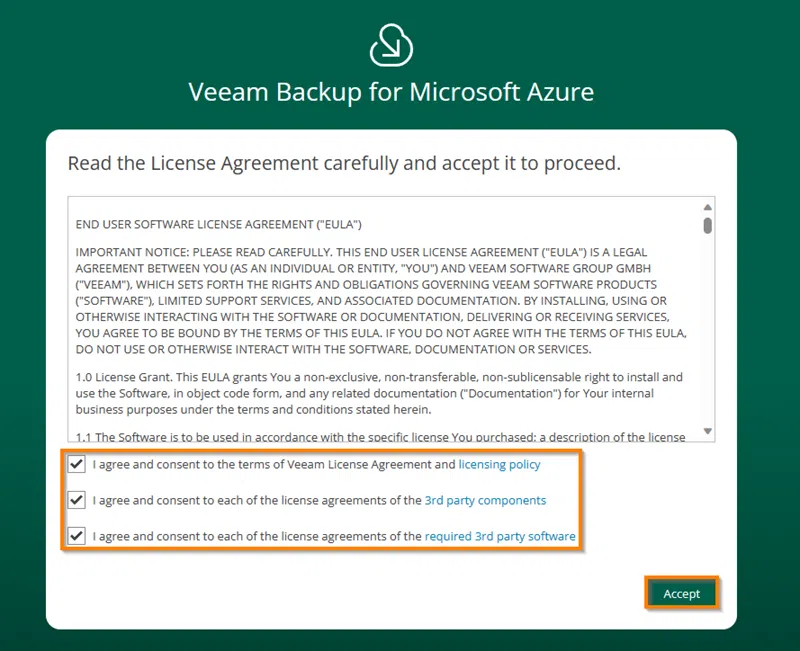 Une fois connecté, vous devrez valider les termes et contrats de licences Veeam puis cliquer sur « Accept ».