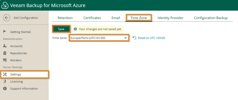 Par défaut, le fuseau horaire utilisé et UTC+0. Il peut être nécessaire de modifier celui-ci pour correspondre à votre fuseau horaire. Pour ce faire, cliquez sur « Settings » sous la catégorie « Server Settings » du menu à gauche. Ensuite, cliquer sur l’onglet « Time Zone » puis sélectionner le fuseau horaire correspondant à votre besoin puis sur « Save ».