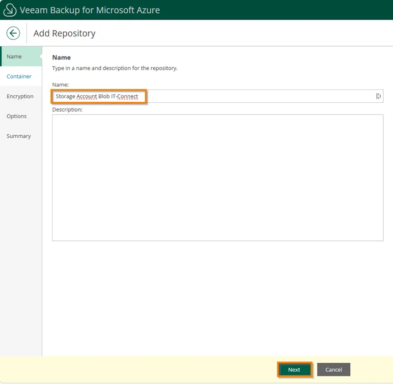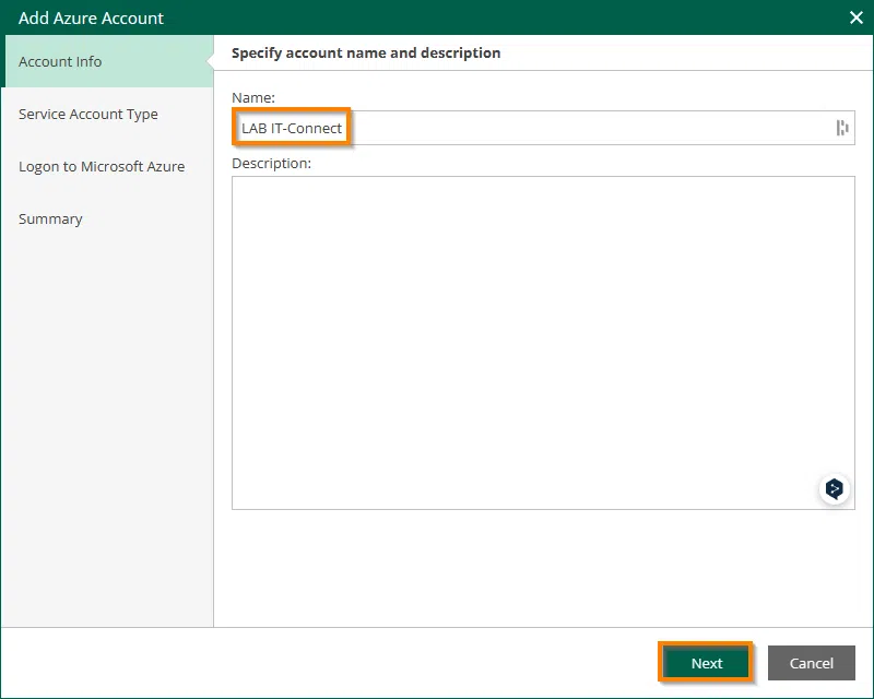 L’assistant de d’ajout d’un compte Azure s’ouvre. Saisissez un nom pour ce compte Azure dans Veeam Backup, une éventuelle description et cliquez sur « Next ».