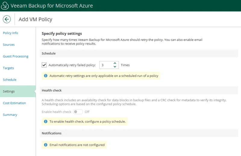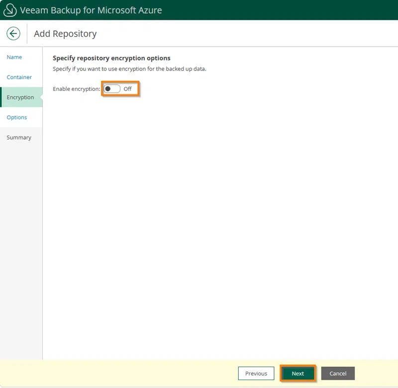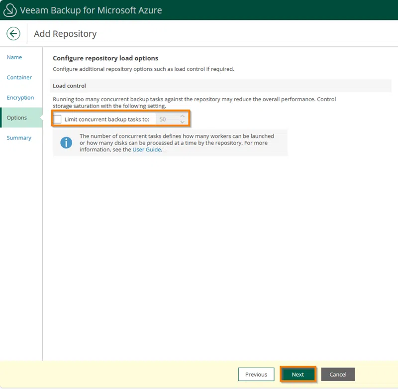 En activant le chiffrement par Veeam Backup for Azure, le temps de sauvegarde sera impacté et les tâches prendront davantage de temps. Cela est à prendre en compte dans votre fenêtre de temps de sauvegarde.