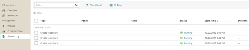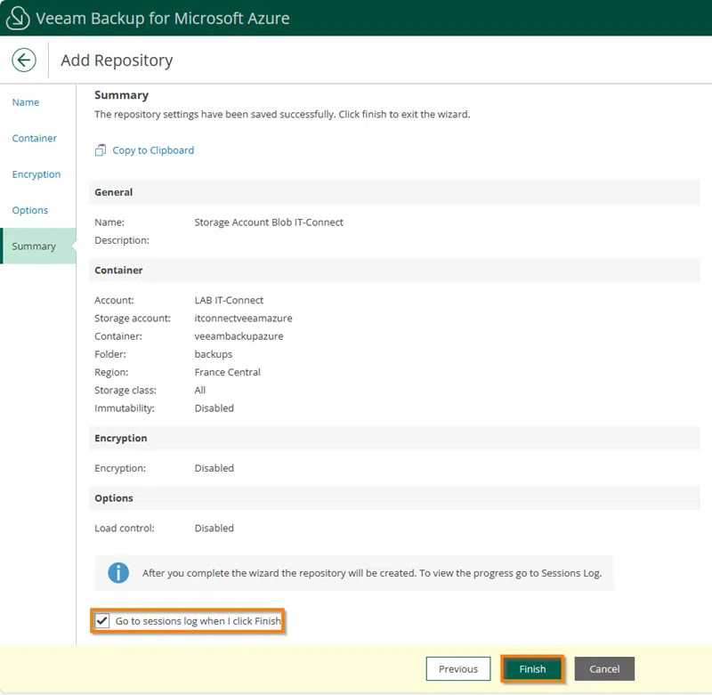 Par défaut, l’option « Go to sessions log when I click Finish » est cochée. Cela aura pour effet de vous rediriger vers les logs d’évènements pour vous assurer que la création des différents types de stockage s’exécute correctement.