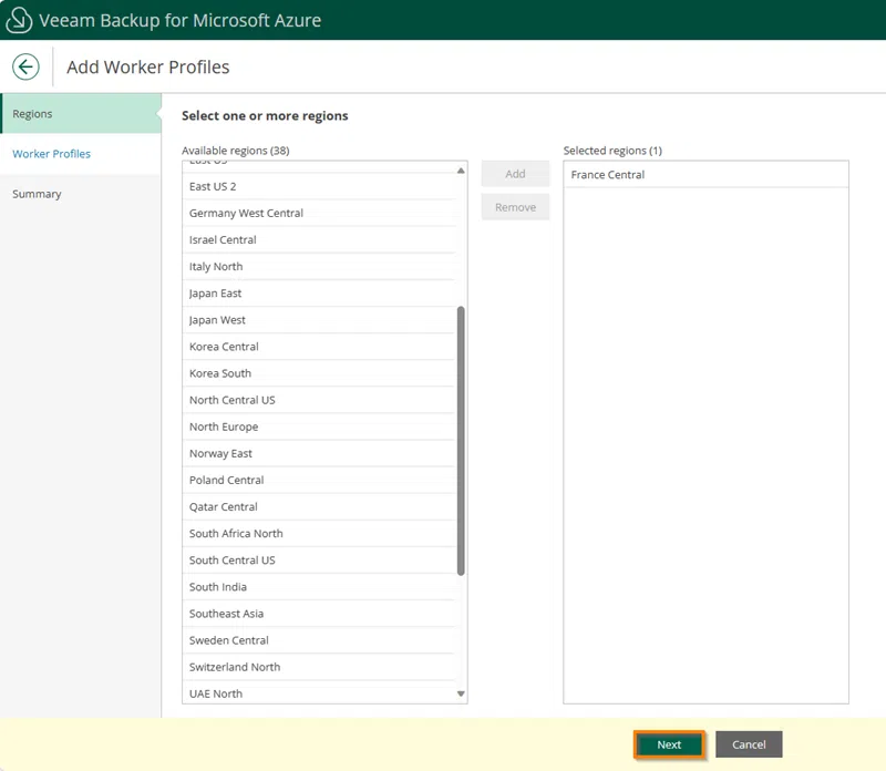 L’assistant de configuration des profils des instances de Workers s’ouvre. La première étape va consister à sélectionner la ou les régions dans lesquelles vous souhaitez que les instances soient déployées.