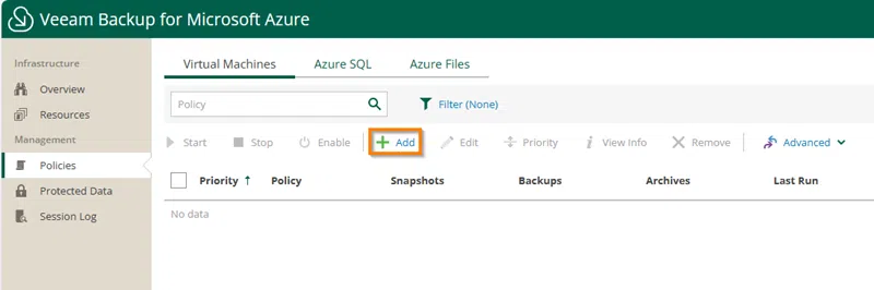 Sur cette page, nous cliquons sur « Add » pour ouvrir l’assistant de création de stratégie de sauvegarde.