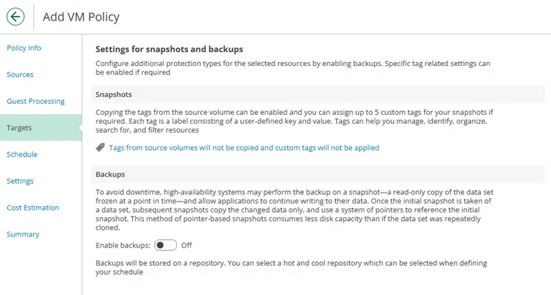 Ici, nous pouvons définir des tags aux snapshots créés par Veeam ainsi que gérer une sauvegarde en lecture seule en cas de sauvegarde d’une ressource en cours d’utilisation.
