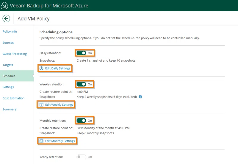 L’étape qui suit est celle qui va nous intéresser, à savoir : définir la rétention journalière, hebdomadaire et mensuelle. Utiliser les boutons « On / Off » pour activer les stratégies voulues. En cliquant sur « Edit Settings », vous pouvez personnaliser la stratégie à votre convenance.