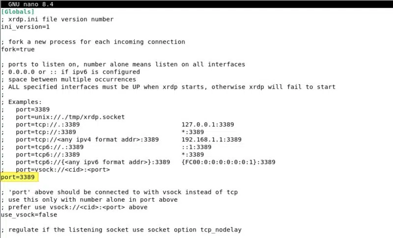 Dans ce fichier, vous pouvez modifier le port d'écoute du serveur xRDP pour ne pas utiliser 3389. C'est une bonne pratique de ne pas utiliser le port par défaut pour ce type de service. Cela se configure au niveau de la directive suivante qu'il suffit de modifier :
