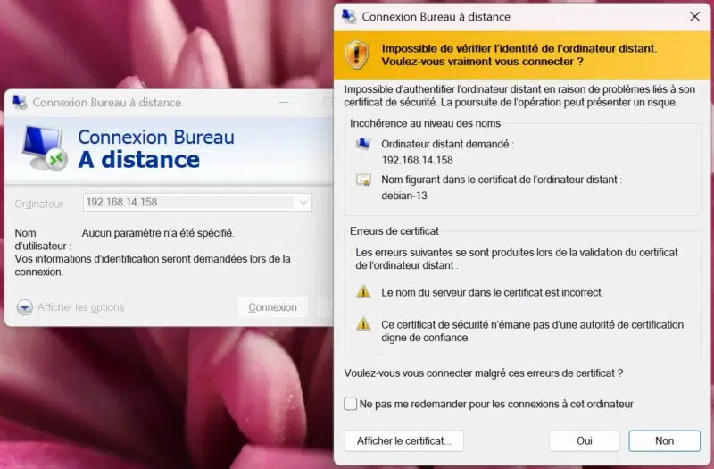 Depuis la machine Windows, il suffit d'ouvrir le client Bureau à distance, de saisir l'adresse IP de l'hôte Linux et de se connecter. Comme c'est la première connexion, il faudra accepter le certificat. Si vous utilisez un port spécifique, pensez à l'indiquer sous cette forme : <adresse IP>:<port>.