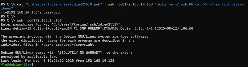 cat "C:\Users\Florian/.ssh/id_ed25519.pub" | ssh [email protected] "mkdir -p ~/.ssh && cat >> ~/.ssh/authorized_keys