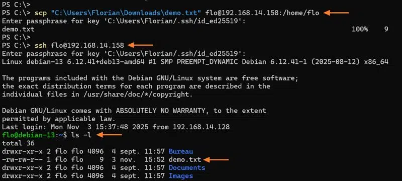 scp "C:\Users\Florian\Downloads\demo.txt" [email protected]:/home/flo
