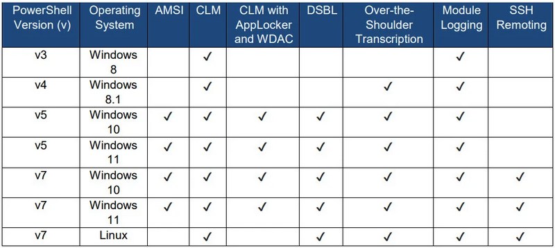 En ce qui concerne les logs, il est recommandé d'enregistrer l'activité PowerShell et de surveiller les journaux pour être capable de détecter une activité malveillante (PowerShell et la transcription). La NSA mentionne les fonctionnalités suivantes : Deep Script Block Logging (DSBL), le module Logging, et la fonction de transcription Over-the-Shoulder (OTS). Comme le montre le tableau ci-dessous, toutes les fonctionnalités ne sont pas prises en charge par les différentes versions de PowerShell.