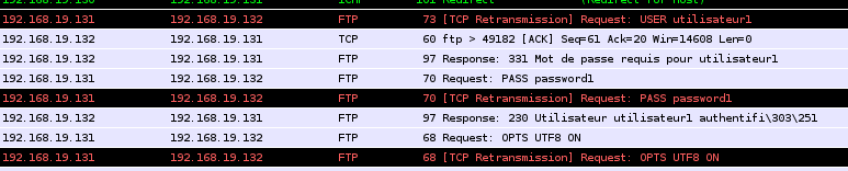 Nous allons maintenant poursuivre notre attaque MITM en effectuant une requête FTP de la part de notre client vers notre serveur. En toute logique, les paquets vont donc atterrir chez notre pirate car le client va utiliser sa table ARP (falsifiée), le switch va donc envoyer ces paquets à notre pirate car il fait correctement son travail (un peu bêtement d'ailleurs), pirate qui va faire suivre les paquets vers le serveur car il a l’IP forwarding d’activé. On procède donc à une écoute réseau sur notre pirate avec Wireshark durant la requête :
