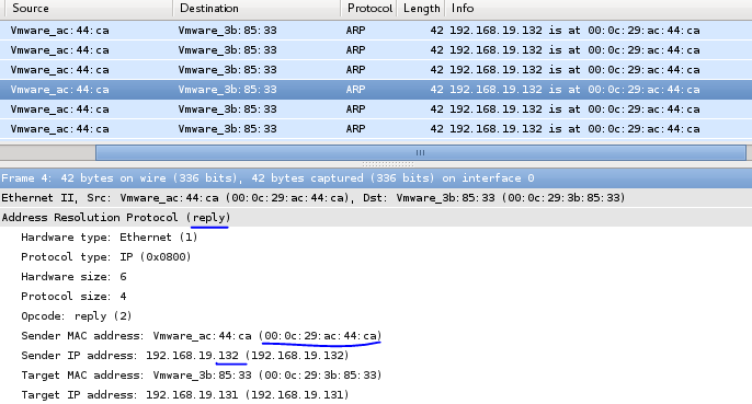 On remarque l’envoi de paquet ARP reply indiquant que l’IP du serveur (192.168.19.132) a maintenant l’adresse MAC du pirate (00:c:29:ac:44:ca), il s'agit ici d'une donnée qui est fausse et falsifiée par l'action du pirate.