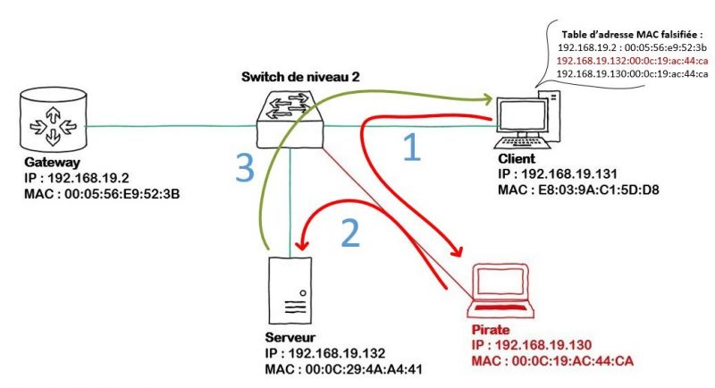 Cela vient du fait que l’enregistrement est marqué comme dynamique, donc volatile, et qu’il peut être mis à jour à chaque réception de paquet présentant des couples IP – MAC différents. Les paquets que le client va générer à destination du serveur vont donc à présent se former avec l’adresse IP destination du serveur et avec l’adresse MAC destination du pirate étant donné qu’il se base pour cela sur sa table ARP et que celle-ci est falsifiée.